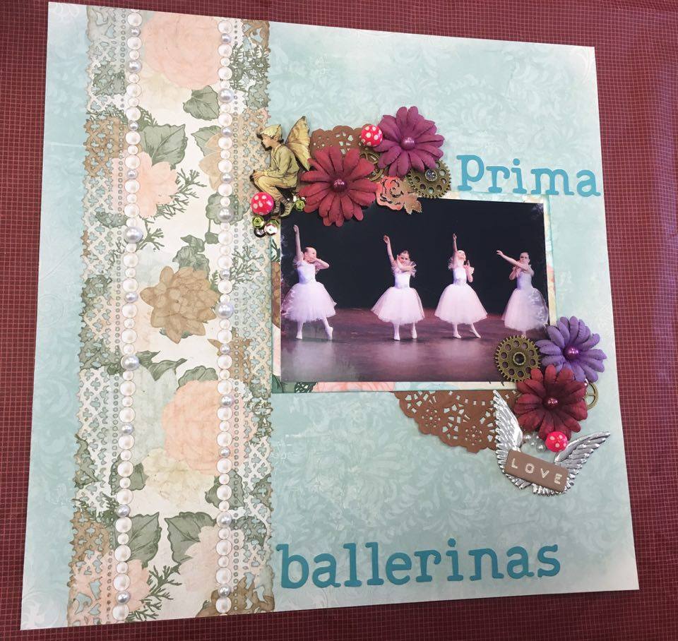 The next project I was doing was a layout for one of the crop challenges that Treasured did. They give you a bag with several items in it and you have to create something using everything in the bag. You don't have to use it all but at least parts of everything. I knew about these challenges from other crops so came prepared with a picture to use. I did a layout using a picture of my nieces from when they did ballet. Really happy with the end result.